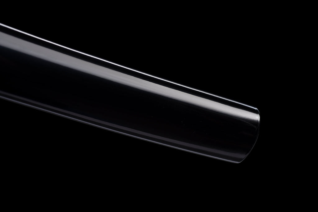 Scheide (Saya 鞘): Hochglanzlack in Schwarz mit auffälliger silberner Drachen-Einlage, perfekt ergänzt durch die dunkelblaue Sageo-Kordel.