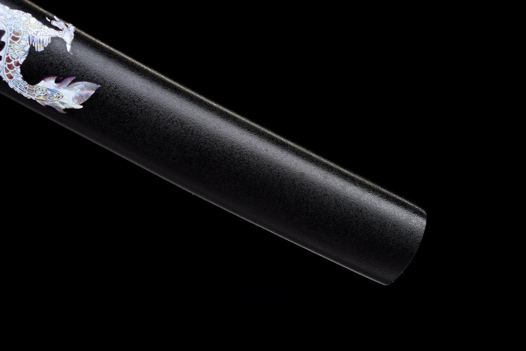 The alloy fittings feature traditional dragon imagery in black and gold, reinforcing the sword’s celestial theme. The tsuba is sculpted with ornate detailing, while the fuchi and kashira complete the look with refined accents inspired by classical Japanese metalwork. The saya is finished in a deep lacquered black, decorated with a stunning mother-of-pearl style dragon chasing the sacred pearl, giving the scabbard a luminous, premium finish.