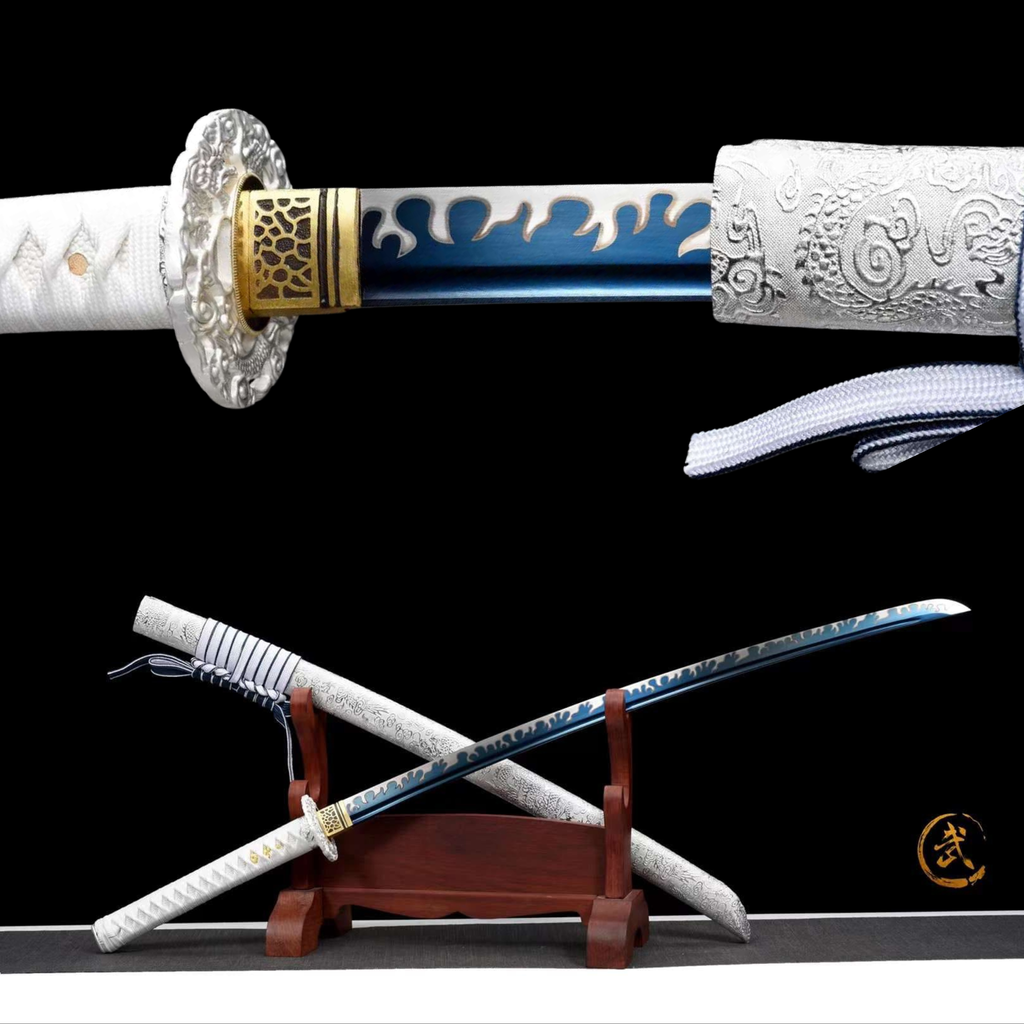 Klinge (刀身) : Die aus Manganstahl gefertigte Klinge hat einen auffallend blauen Farbton, der an die Kälte und Klarheit von Eis erinnert. Dieser Stahl ist für seine Härte und Verschleißfestigkeit bekannt und bietet dem Benutzer eine außergewöhnliche Haltbarkeit und Zuverlässigkeit bei der Ausübung und Handhabung.