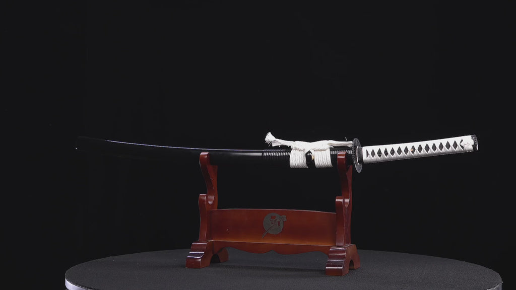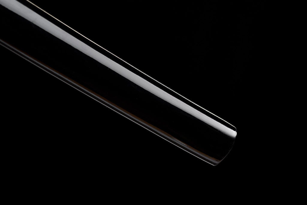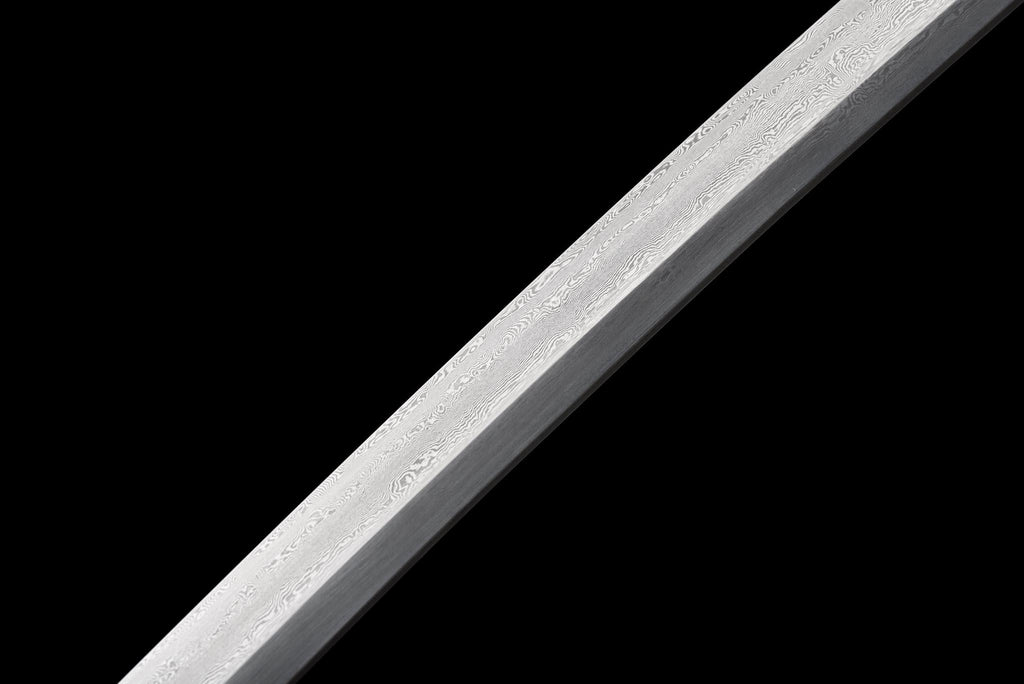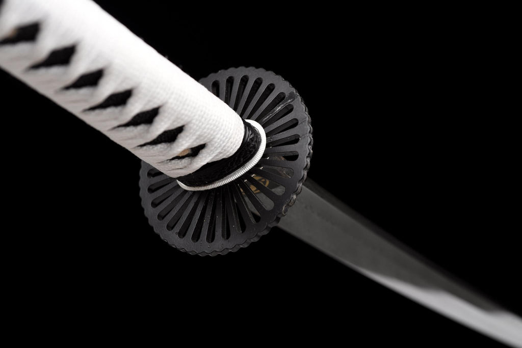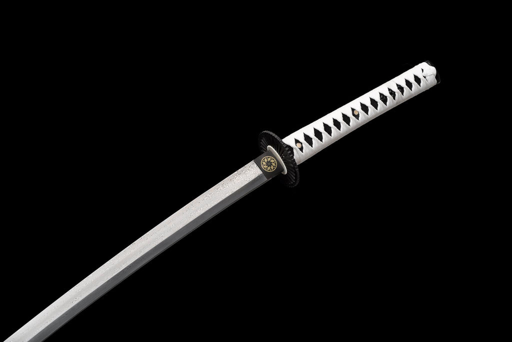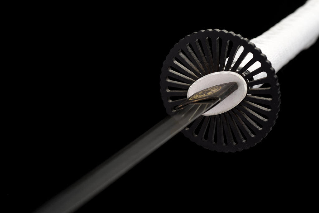 Das Shirasagi no Katana („Weißer Reiher Schwert") verkörpert Reinheit, Präzision und ruhige Stärke. Geschmiedet aus gefaltetem Damaststahl offenbart die Klinge faszinierende geschichtete Maserung und ein sanftes Wellen-Hamon, das Wellen über stillem Wasser widerspiegelt. Seine makellose weiße Tsuka gepaart mit einer tiefschwarzen Lack-Saya symbolisiert die perfekte Harmonie von Licht und Schatten — Gelassenheit ausbalanciert durch Kraft.