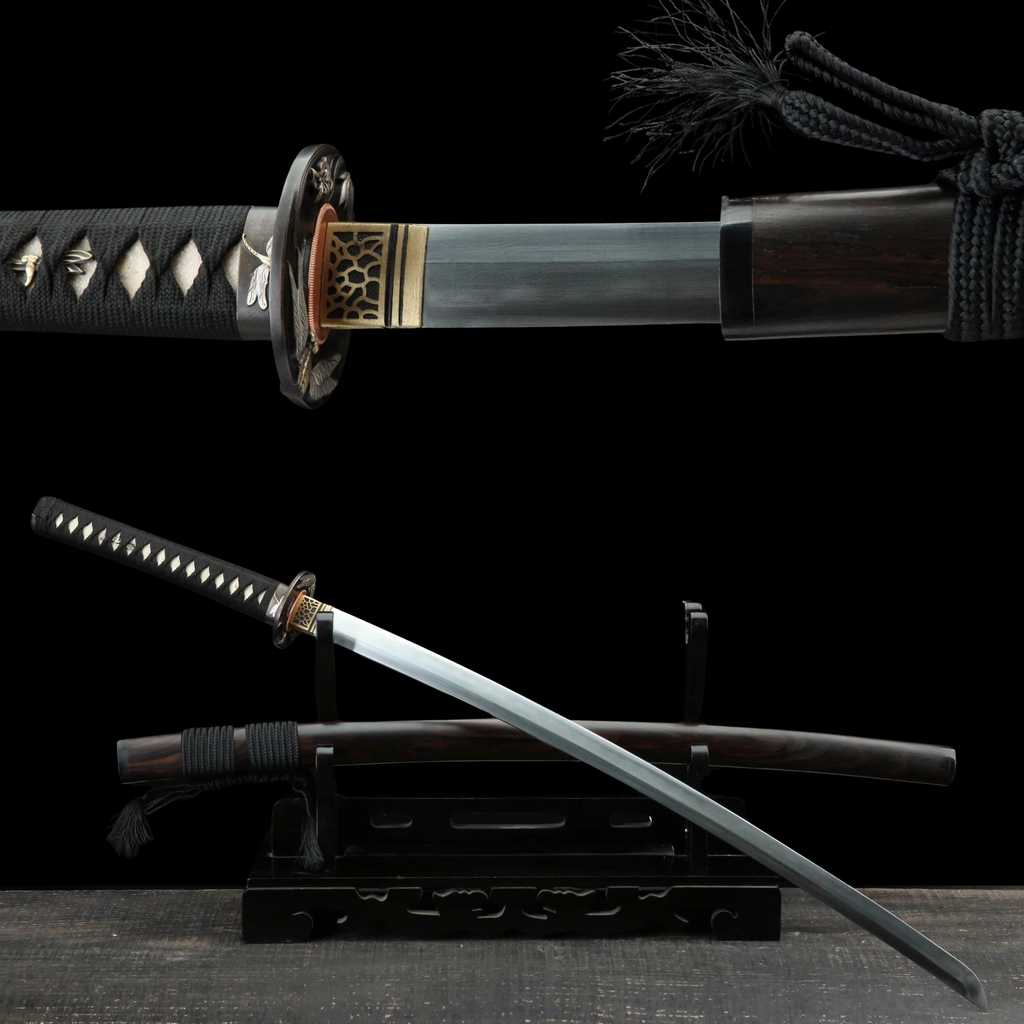 Fourreau (Saya 鞘) : Das massive Ebenholz der Saya, das für seine Härte und Robustheit bekannt ist, schützt die Klinge effektiv. Das Ebenholz bietet Widerstandsfähigkeit gegen die Elemente und eine längere Lebensdauer, während es einen starken visuellen Kontrast zur Klinge bildet.