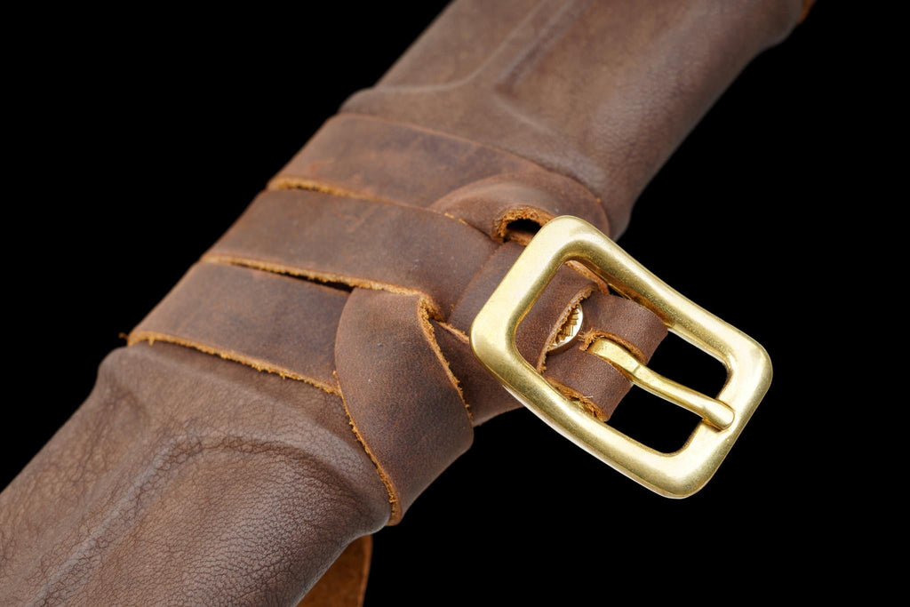 Holzbasis mit handgenähtem künstlichem Leder umwickelt mit Messingschnallen |