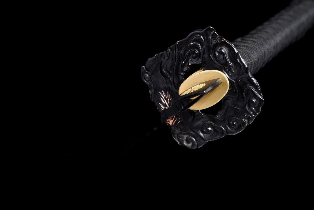Das Kokuenmaru 黒炎丸 ist ein Ausdruck gezähmter Wildheit — ein Katana, geschmiedet für diejenigen, die verstehen, dass wahre Kraft still ist. Sein geschwärzter Kupfer-Drachentsuba wickelt sich schützend um die Klinge, während das goldene Chrysanthemum-Wappen in der Nähe des Habaki an die Würde der japanischen kaiserlichen Abstammung erinnert.