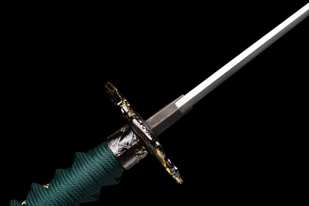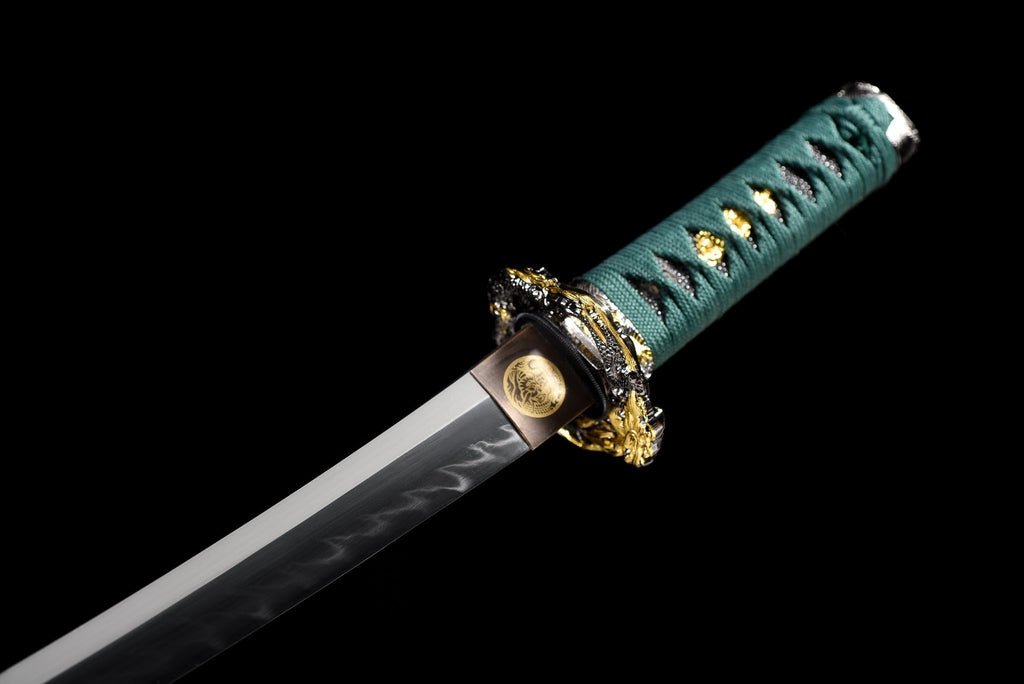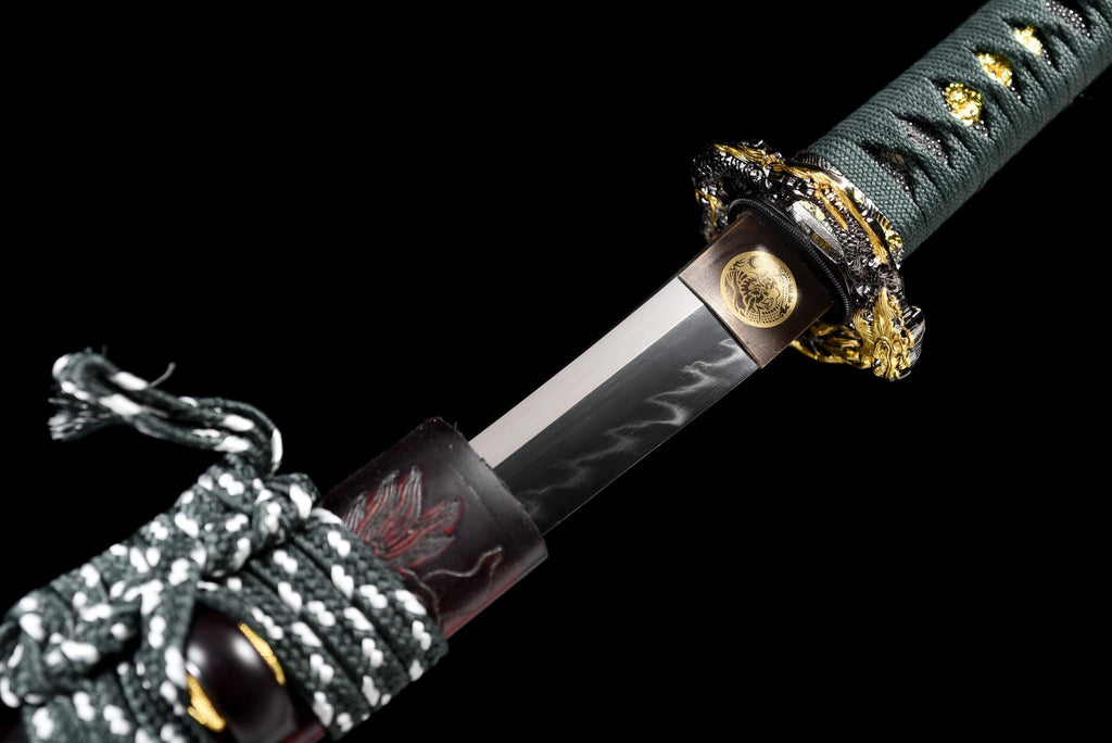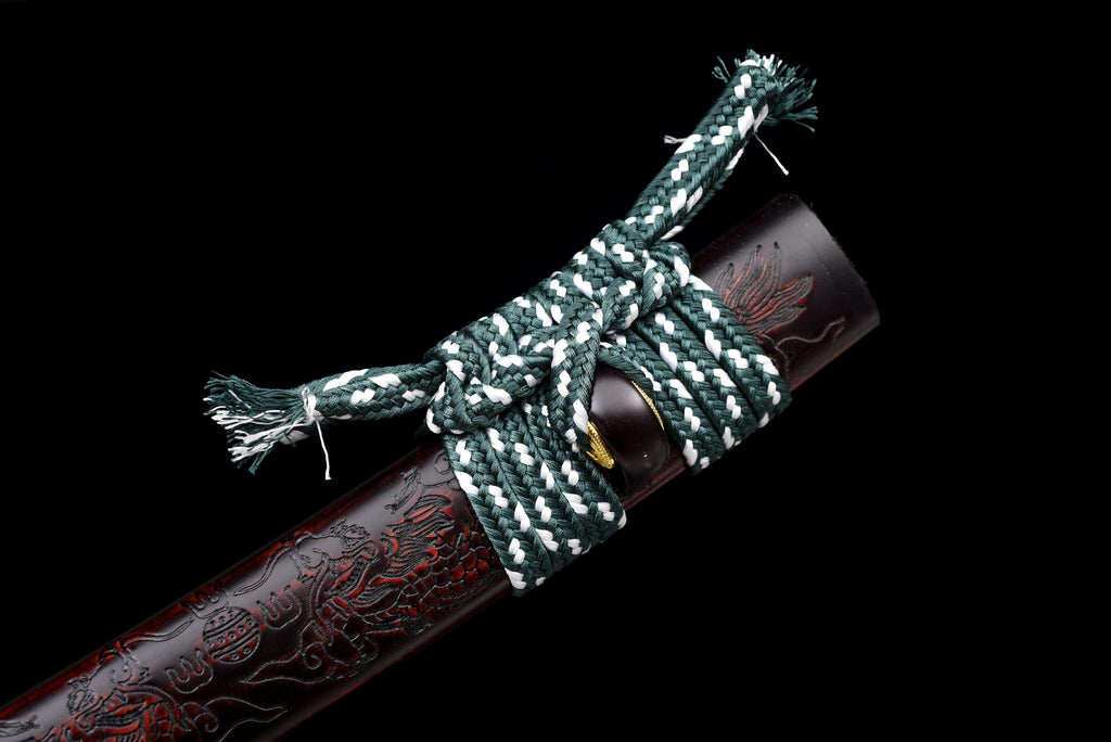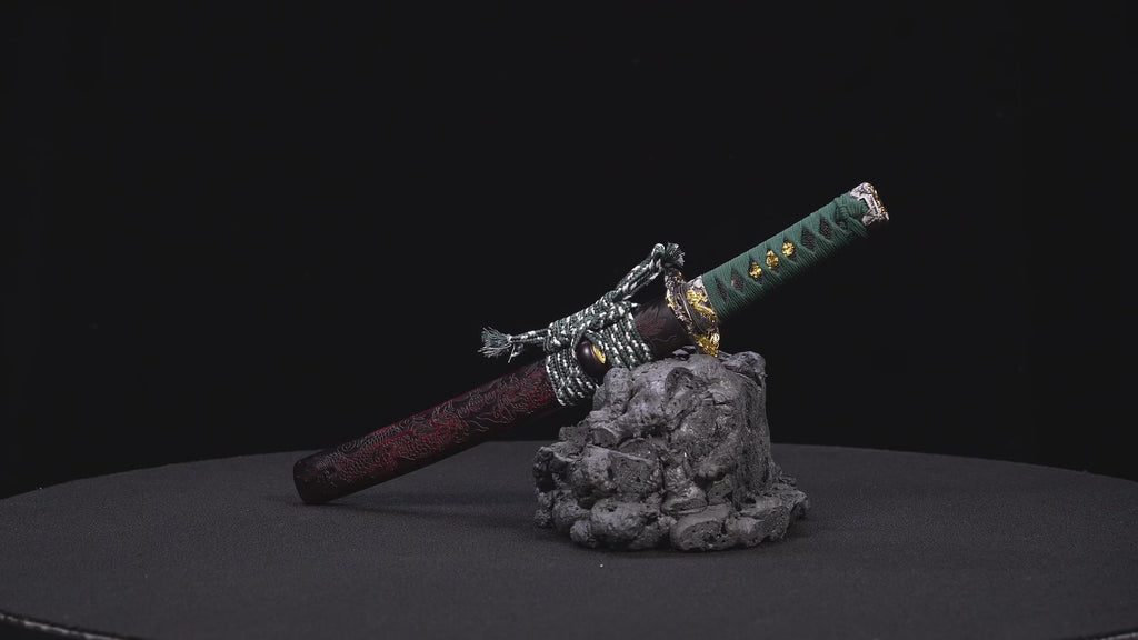 Geschmiedet aus hochkohlenstoffhaltigem T10-Stahl und poliert, um ein klares Hamon zu offenbaren, steht dieses Tanto als Symbol für Widerstandsfähigkeit und Disziplin. Die elegante Farbharmonie zwischen der grünen Tsuka und der geschnitzten rot-schwarzen Saya macht es sowohl zu einer funktionalen Klinge als auch zu einem Kunstwerk.