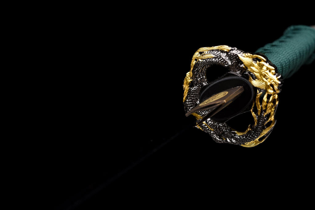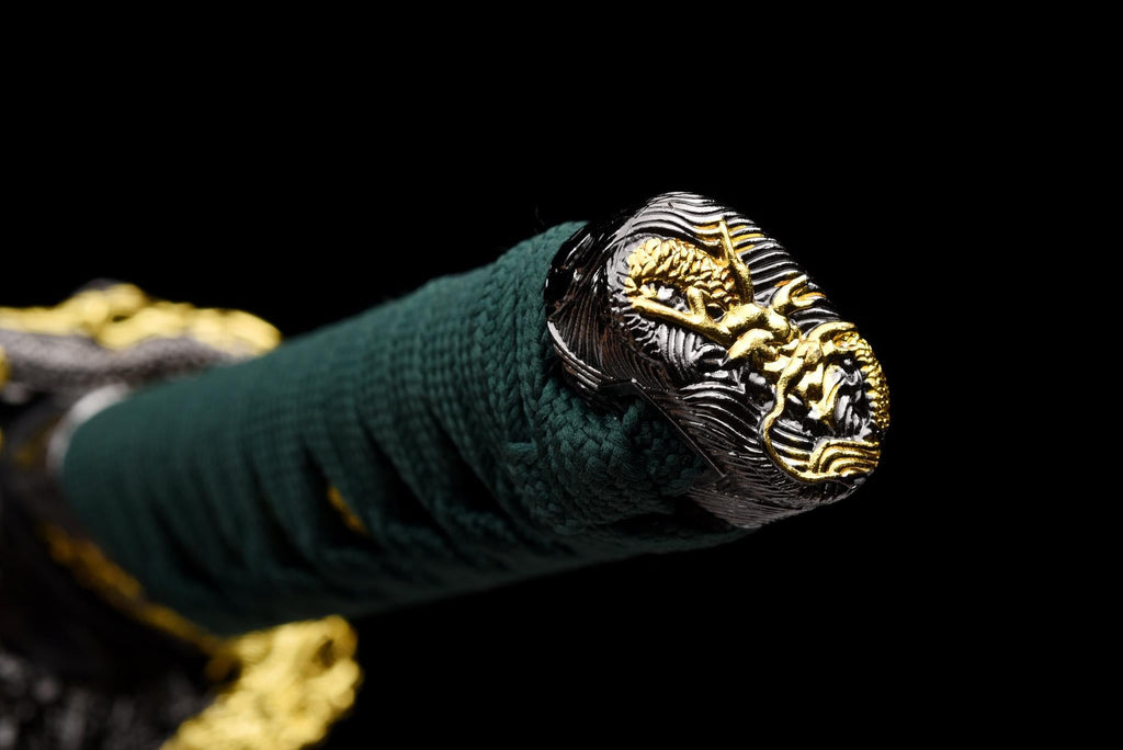 Holzkern umwickelt mit waldgrünem Ito über schwarzem Samegawa (Rochenhaut). Goldene Menuki akzentuieren den Griff und fügen einen subtilen Kontrast und eine luxuriöse Note hinzu. |