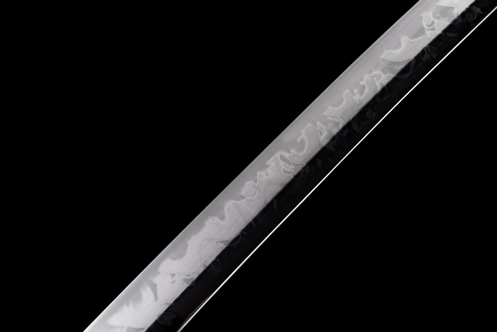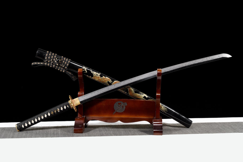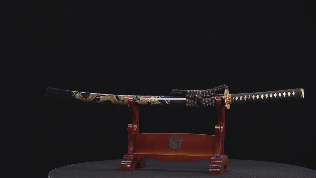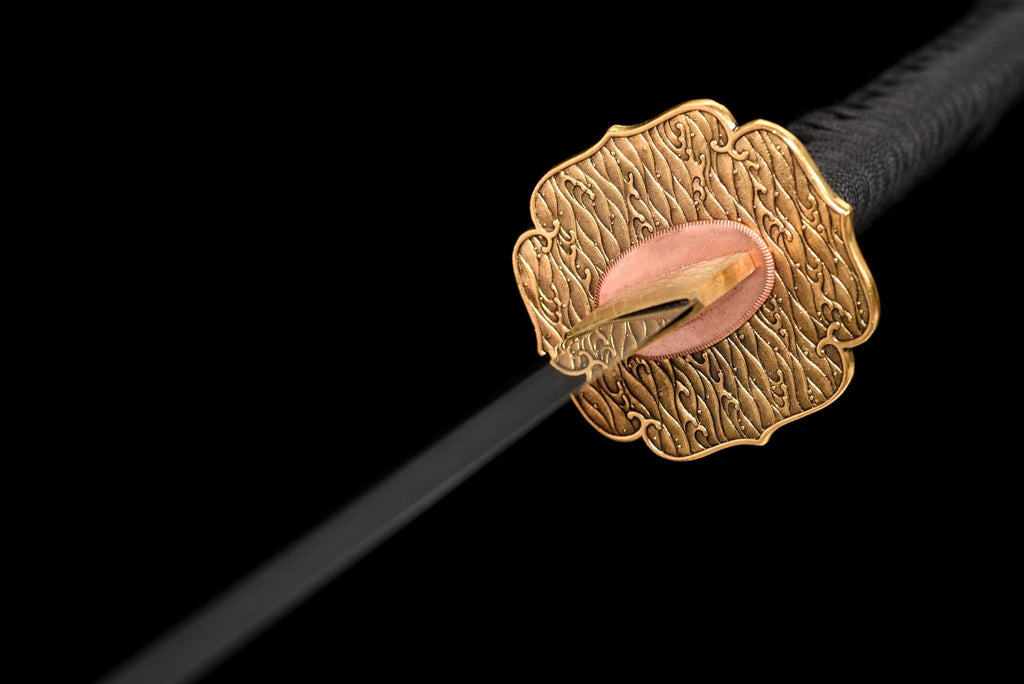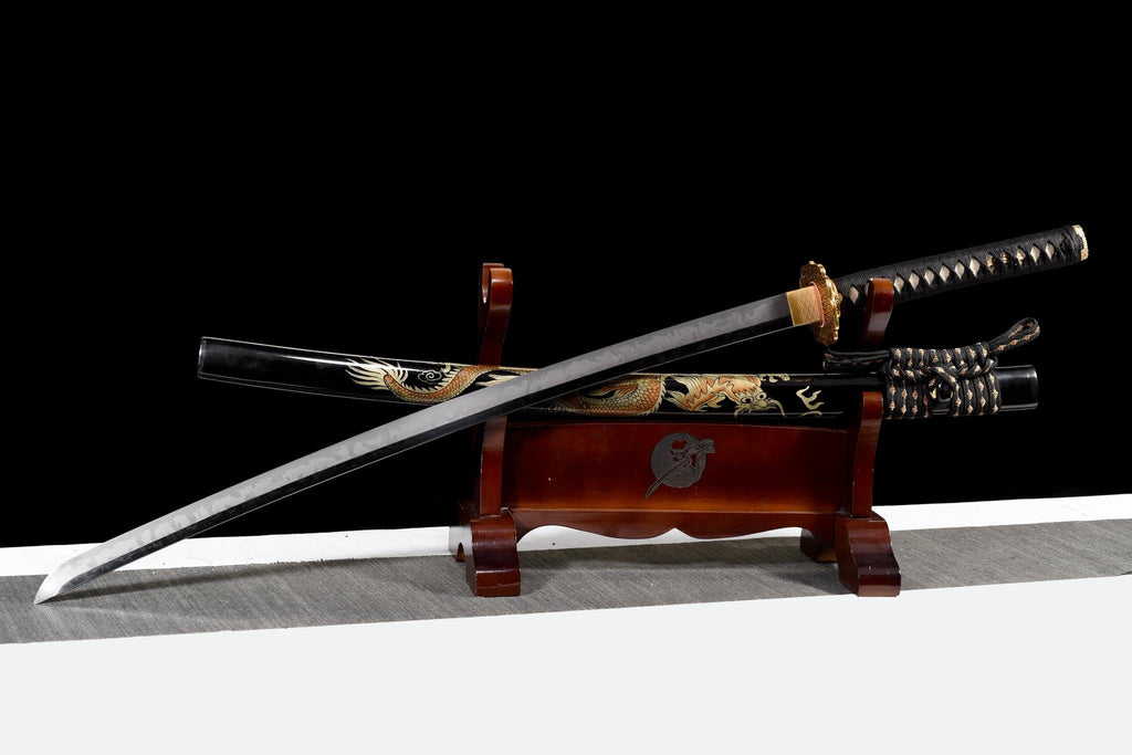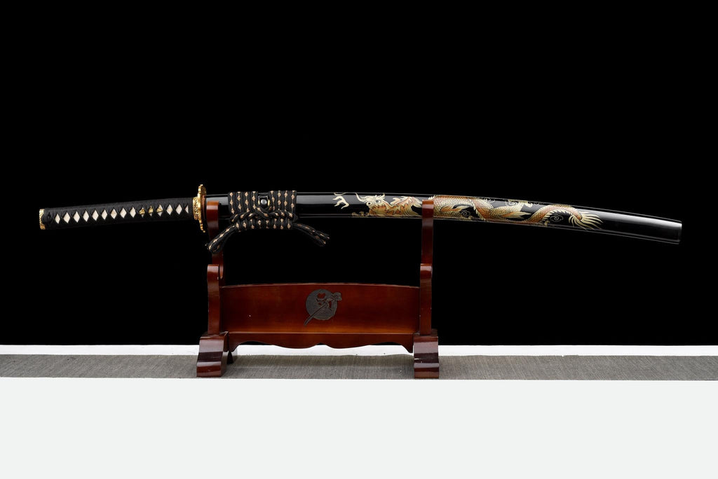 Das Ryūō Katana zelebriert die Kraft und das Glück des Drachen. Eine handbemalte schwarze Saya zeigt einen sich windenden goldenen Ryū, während warme kupfervergoldete Beschläge Wellen und Wolken widerspiegeln. Geschmiedet als echte Honyaki-Klinge aus T10-Hochkohlenstoffstahl zeigt sie ein lebendiges, sturmartiges Hamon, das über die gesamte Länge der Schneide fließt.