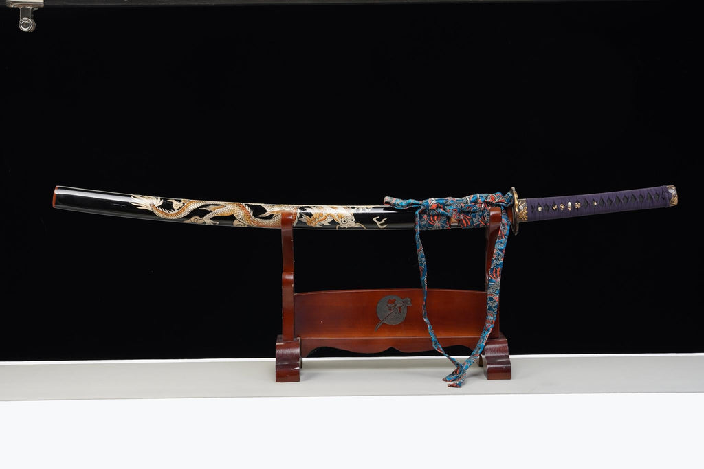 Die Saya (Scheide) ist mit hochglänzendem schwarzem Lack beschichtet und zeigt einen sorgfältig handbemalten goldenen Drachen, der Kraft, Schutz und alte Weisheit symbolisiert. Um die Kurigata ist ein wunderschön gewebtes blau-rot-goldenes Sageo gewickelt, das eine traditionelle und dennoch luxuriöse Note verleiht.
