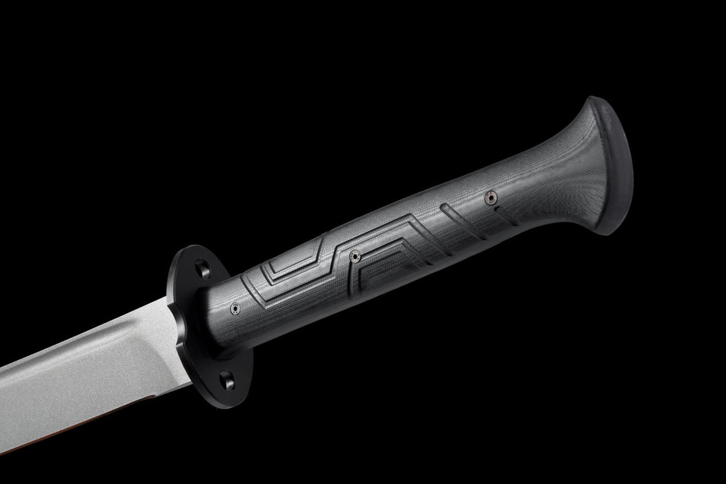 Der Griff ist aus robustem G10 gefertigt und mit präziser Konturierung für einen sicheren Griff unter allen Bedingungen geformt. Seine ergonomische Geometrie bietet außergewöhnliche Kontrolle, während das verlängerte 21cm Design die Hebelwirkung bei kraftvollen Schlägen erhöht.